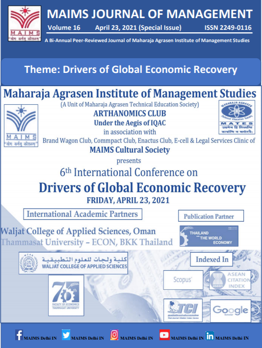 “MAIMS Journal of Management” is a biannual refereed and reviewed journal of Maharaja Agrasen Institute of Management Studies (MAIMS). It carries ISSN 2249-0116 and is registered with Registrar of Societies vide no. DELENG/15227/29/1/2006-TC.